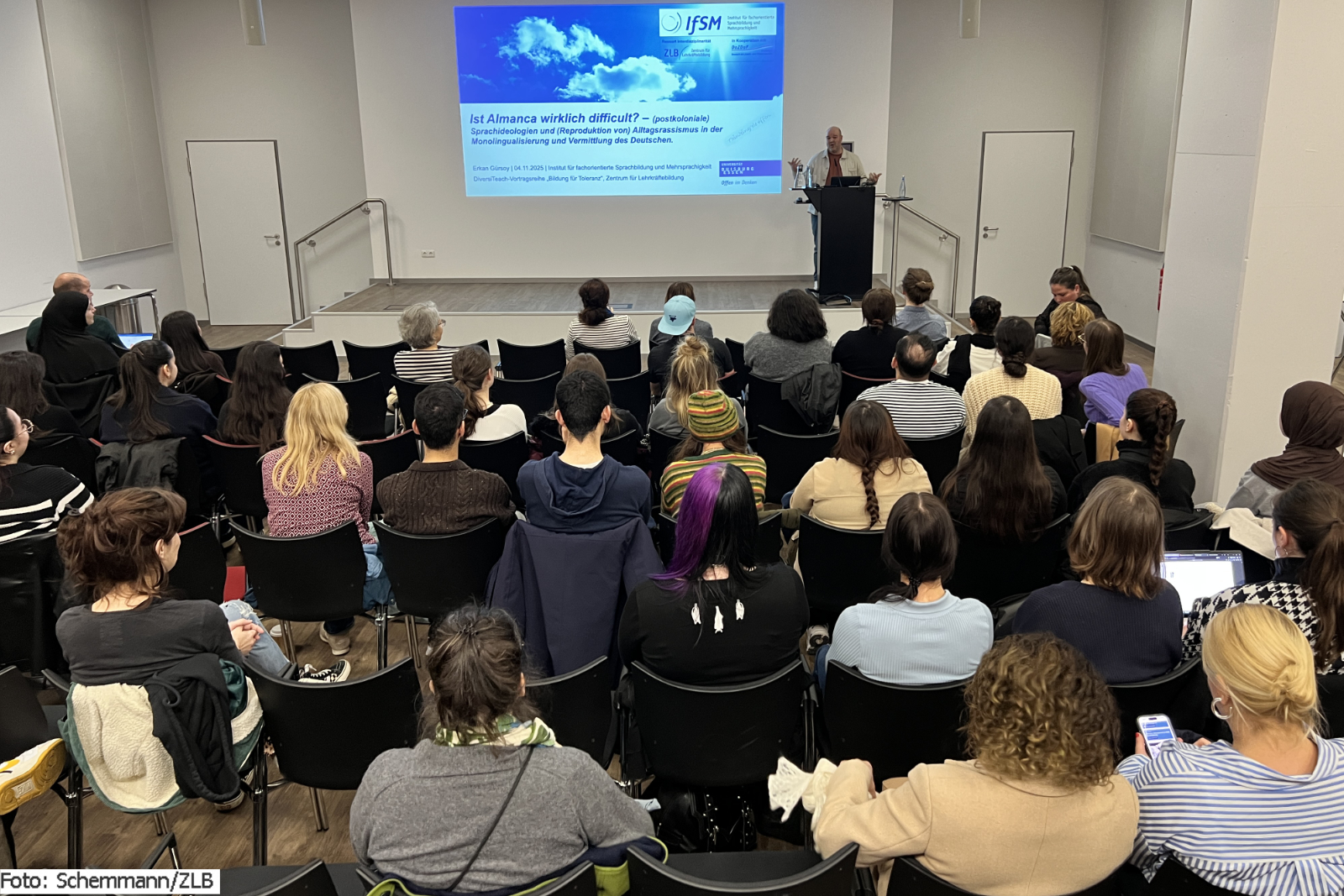 Dr. Erkan Gürsoy begeisterte am 04. November 2025 rund 70 Lehramtsstudierende, Lehrende und Mitarbeitende der Universität Duisburg-Essen (UDE) mit seinem spannenden Vortrag „Ist Almanca wirklich difficult? – (postkoloniale) Sprachideologien und (Reproduktion von) Alltagsrassismus in der Monolingualisierung und Vermittlung des Deutschen“. Eingeladen hatte das Zentrum für Lehrkräftebildung (ZLB) der UDE.